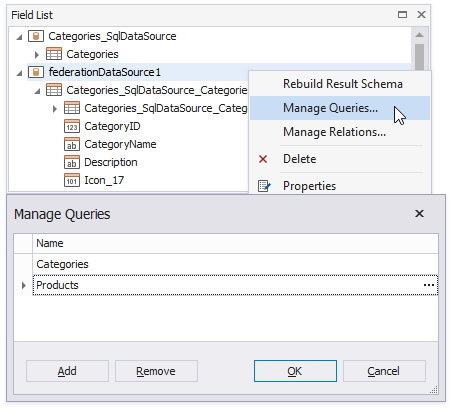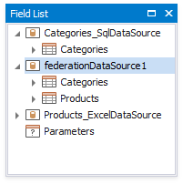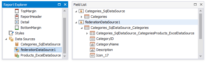 The Data Source Wizard creates a new FederationDataSource that includes two queries with a master-detail relationship. This data source becomes available in the Report Explorer‘s Data Sources node. The Field List reflects the data source’s structure.
