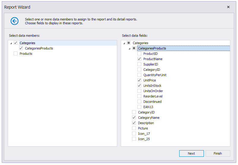 Select data members for the report and its detail reports. Select data fields to display in the report and click Finish. You can also go to the next page to continue layout creation.