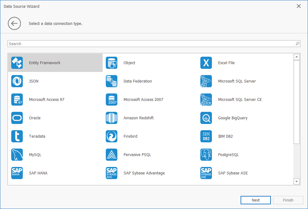 On the first page of the invoked Data Source Wizard, select the Entity Framework and click Next.