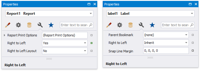 When the Right to Left property of a report is set to Yes, you can also enable the Right To Left Layout property that specifies the position of controls within report bands. Enabling the right-to-left layout will also swap the page margins of a document (it will become impossible to place controls outside the right page margin).