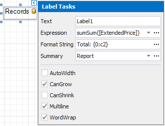 Back in the Label Tasks window, use the Format String property to format the summary’s value (for instance, set it to Total: {0:c2}).