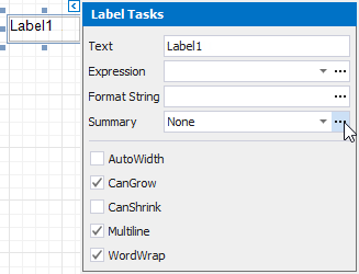 Drop the Label control onto the added band and click its smart tag. In the invoked Label Tasks window, click the Summary field’s ellipsis button.
