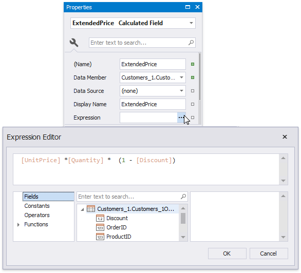 Select the created calculated field, and in the Property Grid, change its name to ExtendedPrice. Click the Expression property’s ellipsis button, and in the invoked Expression Editor, construct the expression based on the UnitPrice, Quantity and Discount fields.