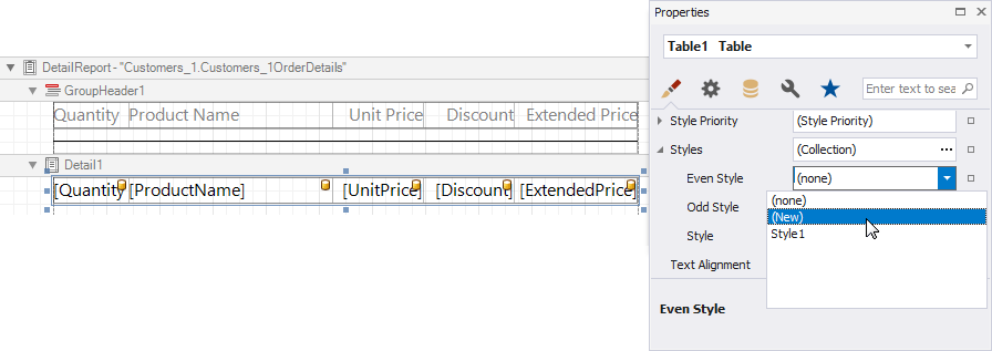 You can provide different appearances to alternating (odd and even) table rows in the detail report. Select the table and expand the Styles property in the Property Grid. Invoke the drop-down list for the EvenStyle property and select New.