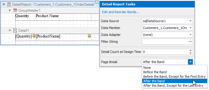 Click the Detail Report band’s smart tag, and in the invoked actions list, set the band’s Page Break property to After the Band to print each order on a separate page.