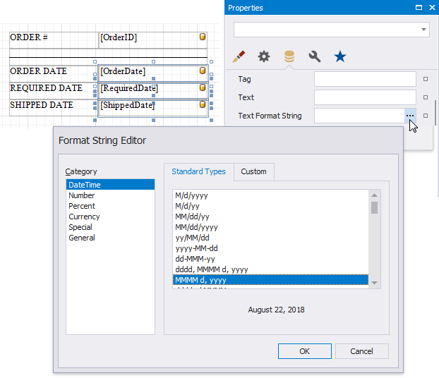 In the master report’s Detail band, select controls bound to date fields while holding down CTRL or SHIFT. Switch to the Property Grid and click the Text Format String property’s ellipsis button. In the invoked Format String Editor, activate the DateTime category and select the format, for example, display dates as a month (name) followed by the day (number) and year (four digits).