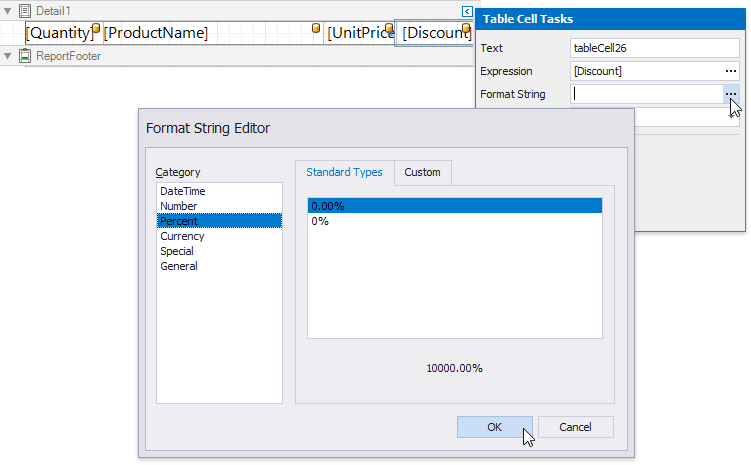 Select the table cell bound to the Discount data field in the detail report’s Detail band and click its smart tag. Click the Format String property’s ellipsis button, and in the invoked Format String Editor, apply the Percent format. In this case, field values are multiplied by 100 and displayed with a percent symbol.