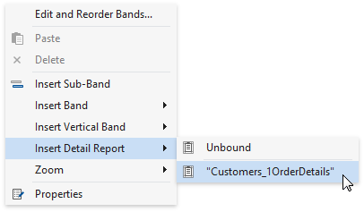 Create a Detail Report Band by right-clicking the report’s surface. In the invoked context menu, select Insert Detail Report, and then, select the master-detail relationship’s name.