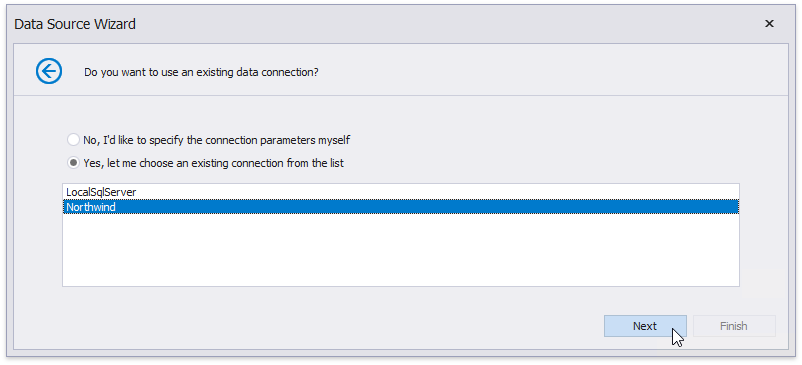 The following page allows you to specify whether you want to use an existing data connection or create a new one. For this example, select an existing connection and click Next.
