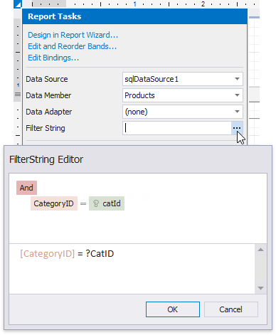 Click the report’s smart tag, and in its actions list, click the Filter String property’s ellipsis button.