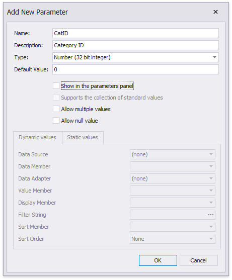 In the invoked Add New Parameter dialog, specify the parameter’s Name and Type as well as disable the Show in the parameters panel option.