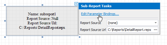 Bind the subreport’s parameter used as a filter criterion to the master report’s corresponding data field, which serve as a source of the parameter value. To do this, click the subreport’s smart tag and select Edit Parameter Bindings in the invoked actions list.