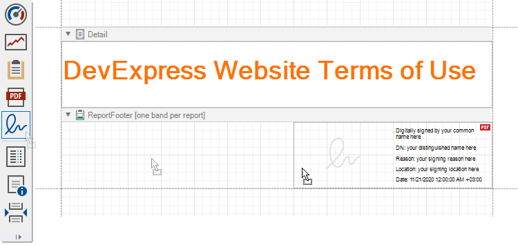 Drop the PdfSignature control from the report controls Toolbox tab onto the Report Footer band.