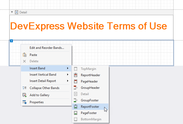 Right-click the design surface. Select Insert Band / ReportFooter from the context menu. Enable the footer band’s Print at Bottom property.