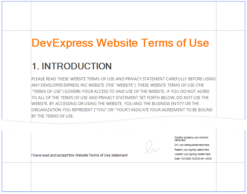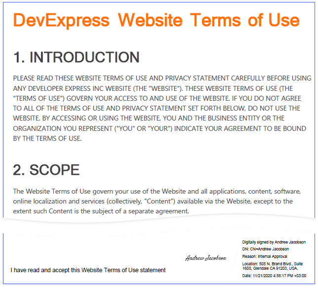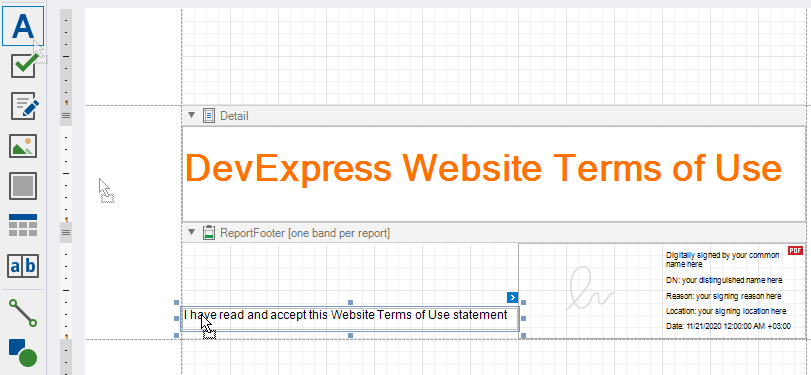 Place the Label control to the left of the PdfSignature control and add the following text: I have read and accept this Website Terms of Use statement.