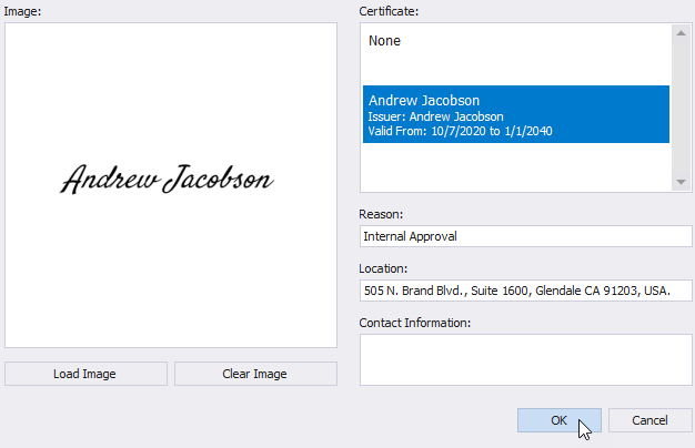 In the invoked Signature Options dialog, choose a certificate and specify signature details.