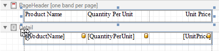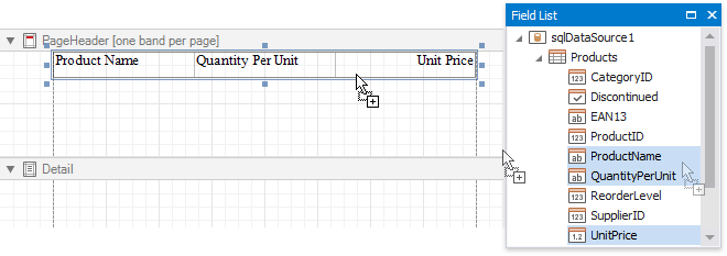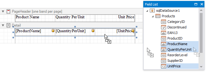 To provide dynamic content to the report, switch to the Field List again and select the same fields. Click the selected fields and drag-and-drop them onto the Detail band.