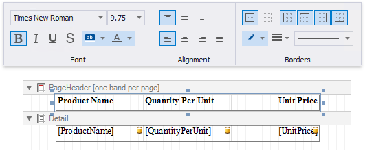 Switch to the Field List and select the required fields by clicking them while holding the CTRL or SHIFT key. Then, drop them onto the Page Header band with the right mouse button to quickly create column headers.