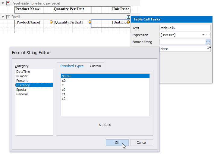 Define a currency format for the UnitPrice cell. Click the cell’s smart tag, and then, click the Format String property’s ellipsis button. Select the appropriate format in the invoked Format String Editor editor and click OK.