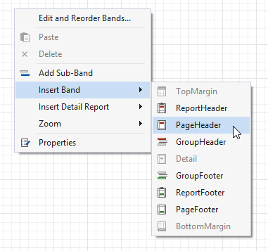 Add the Page Header band to the report to print the column headers at the top of every document page. To do this, right-click the report’s surface, and select Insert Band | PageHeader in the context menu.