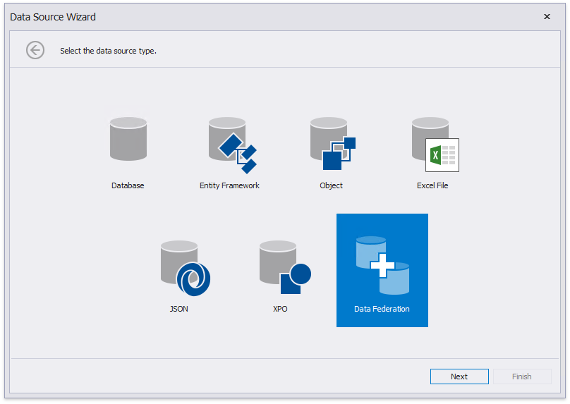 Choose Data Federation to combine multiple data sources and specify unions, joins or master-detail relationships between data source queries.