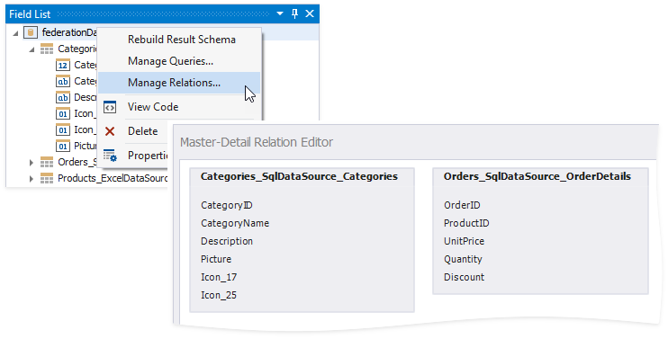 Right-click the federated data source and choose Manage Relations. This invokes the Master-Detail Relation Editor you can use to specify a master-detail relationship between the separate queries.