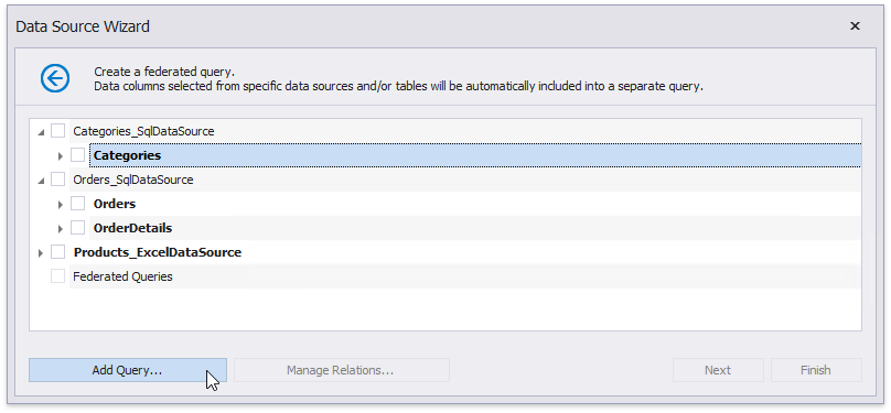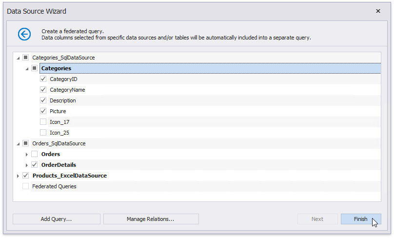 The selected items are included in data federation as separate queries based on initial data source queries.