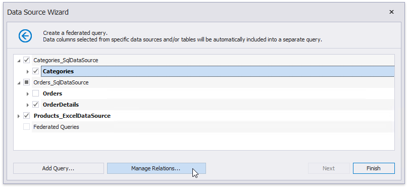 Click Manage Relations to define master-detail relationships between two or more queries.