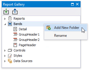 To create a new template, right-click a report band and choose Add To Gallery in the context menu. The band’s Name property value defines the template name.