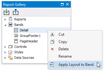 Right-click a template in the Report Gallery and choose Apply Layout to Band in the context menu.