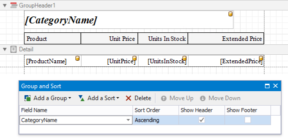 Group the report’s data using the Group and Sort Panel and construct a layout like the following: