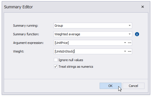 You can also use the control’s Format String property to format the summary value. For instance, set this property to Weighted Average Price: {0:c2}.