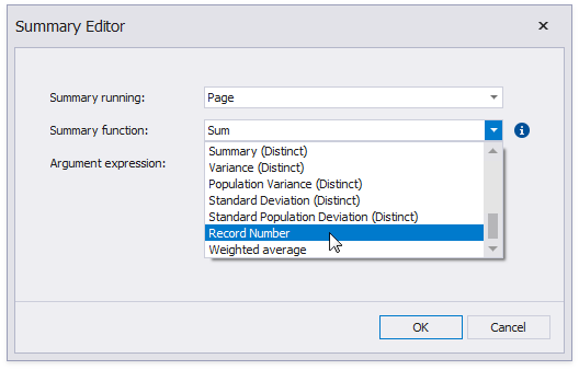 - Set the Summary running property. Select Report to increment the row numbers throughout the entire report, or select Group or Page to reset the row numbers for every group or page.
