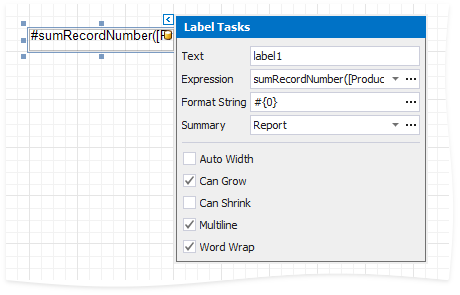 Click the label’s smart tag. In the invoked Label Tasks window, click the Summary property’s ellipsis button.