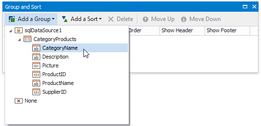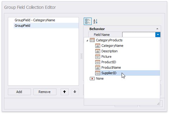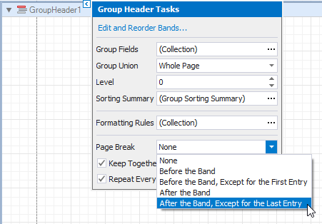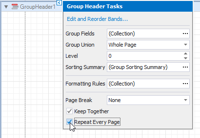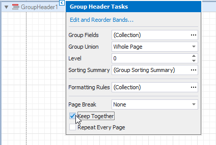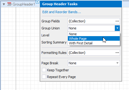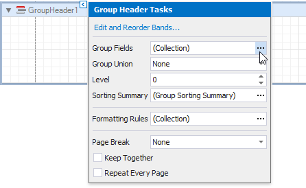 This creates an empty Group Header with a corresponding group field added to its Group Fields collection. You can access this collection by clicking the Group Header’s smart tag.