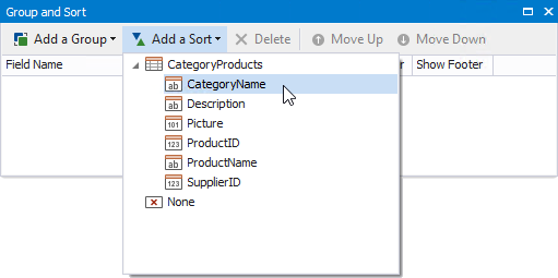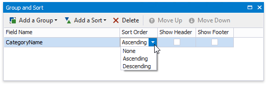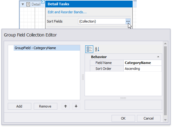 This adds a corresponding sort field to the Sort Fields collection. You can access this collection by clicking the Detail band’s smart tag.