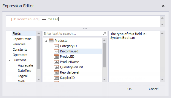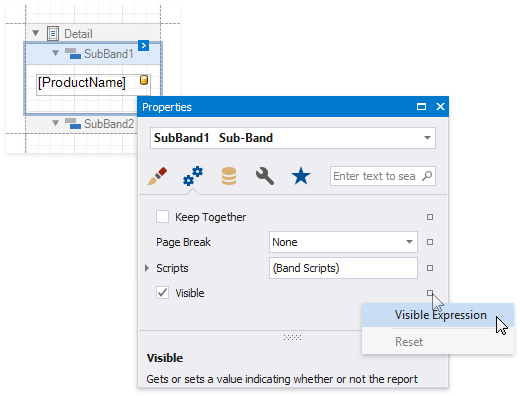 Here, the [Discontinued] == false expression is set for the SubBand1 and the [Discontinued] == true expression for the SubBand2. These expressions specify the Visible property based on the Discontinued data field’s value.