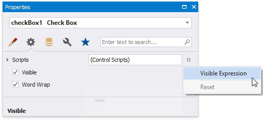 Select the required control and switch to the Property Grid. Open the Behavior tab, click the Visible property’s marker and select Visible Expression in the context menu.