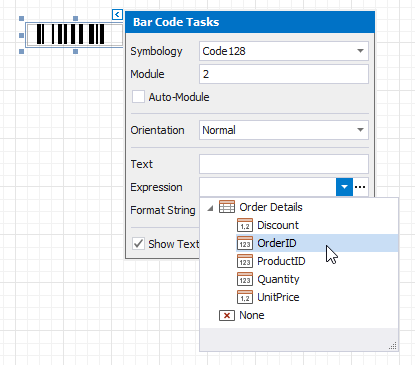 You can bind the bar code’s Text property to a data field obtained from a report’s data source. Click the control’s smart tag, expand the Expression drop-down list and select the data field.
