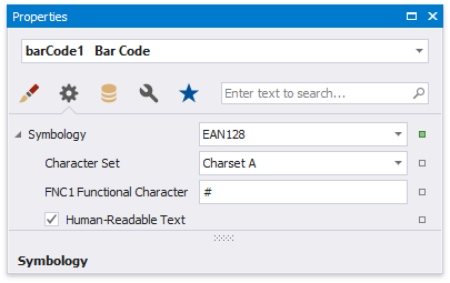 After specifying the symbology, you can customize the type-specific options of the barcode, which are listed in the Property Grid under the Symbology property.
