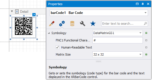In the property grid, expand the Symbology list and specify the following properties specific to GS1 Data Matrix: