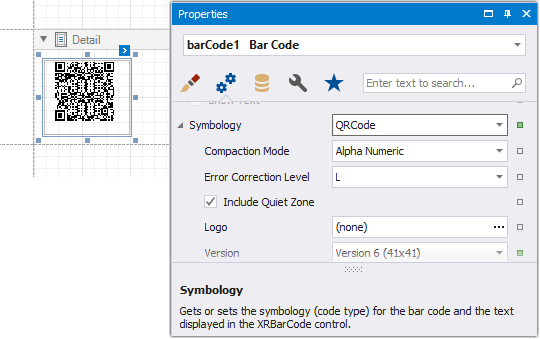 In the property grid, expand the Symbology list and specify the following properties specific to QR Code: