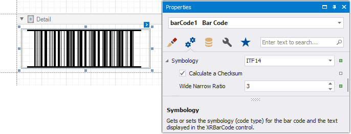 In the property grid, expand the Symbology list and specify the following properties specific to ITF-14:
