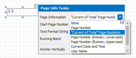 To add a new Page Info control to a report, drag the Page Info item from the Toolbox and drop it onto the required report band.