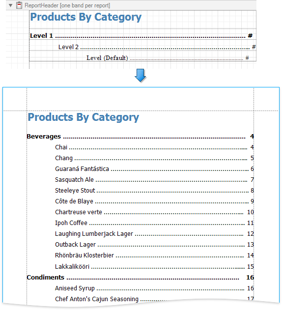 To implement a table of contents, drop the Table Of Contents control from the Toolbox onto the report’s area. If the report does not contain a Report Header at the moment, it is created automatically so that the table of contents can be added to it.