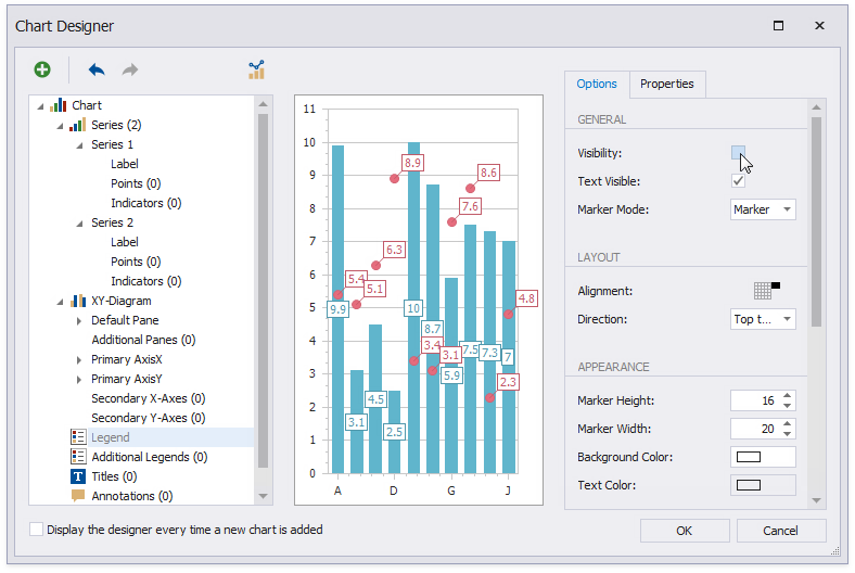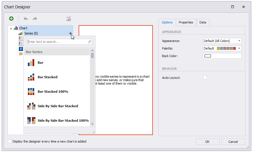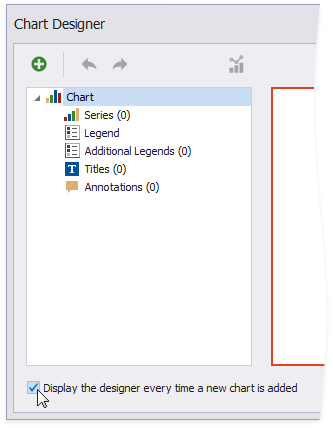 The Chart Designer wizard is invoked. Disable the Display the designer every time a new chart is added option if you do not want to trigger the wizard the next time you create a chart.