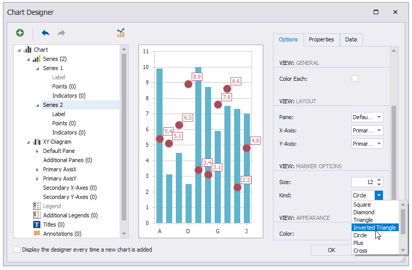 Customize the Series 2 markers’ appearance. Set Size to 12 and Kind to Inverted Triangle to replace the default circle with an upside down triangle.