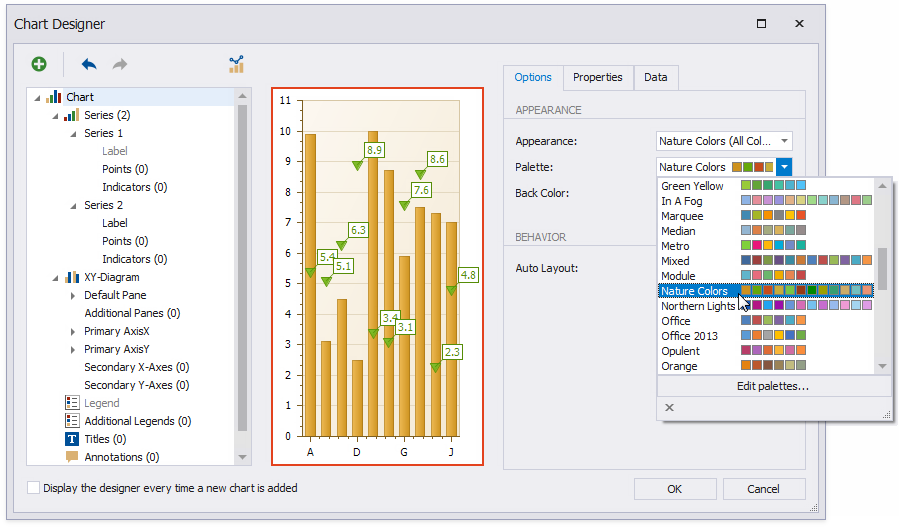 Customize the chart’s appearance settings. For instance, select Nature Colors from the drop-down Palette list.