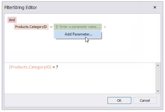 On the right side, use a chart parameter to obtain a group value from the report’s group field. Click the right side’s icon until it turns into a question mark and select Add Parameter from the context menu to invoke the Add New Parameter dialog.