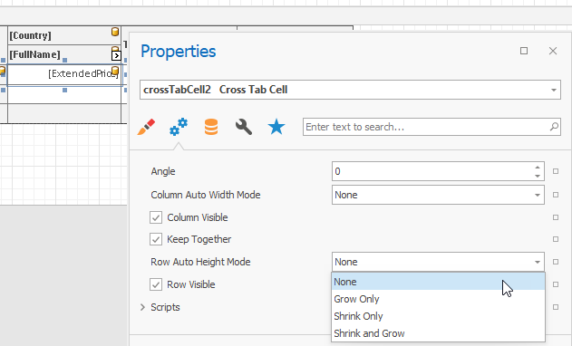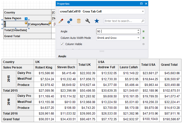 Each Cross Tab cell provides the Angle property that allows you to rotate the cell’s text.